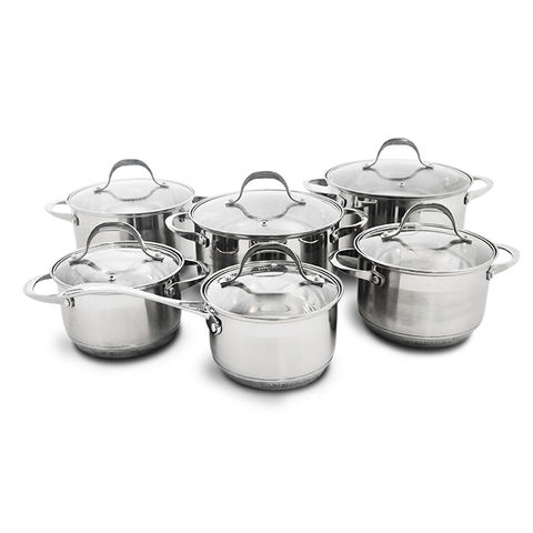 High Quality 12-Piece Stainless Steel Cookware Set Classic Pots Pans Double Bottom Polished Tempered Glass Includes Casseroles